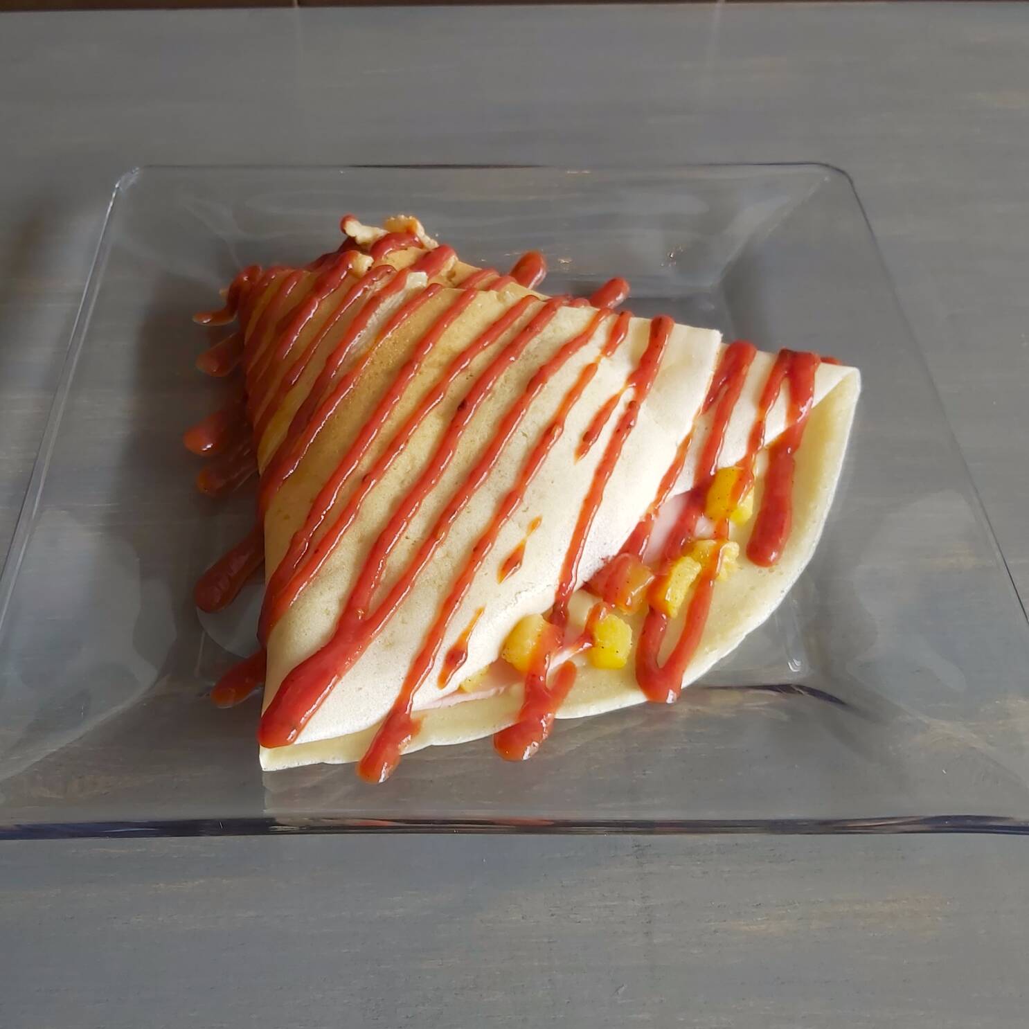 Crepa con queso cheddar, jamón, piña-miel natural y salsa de tomate.