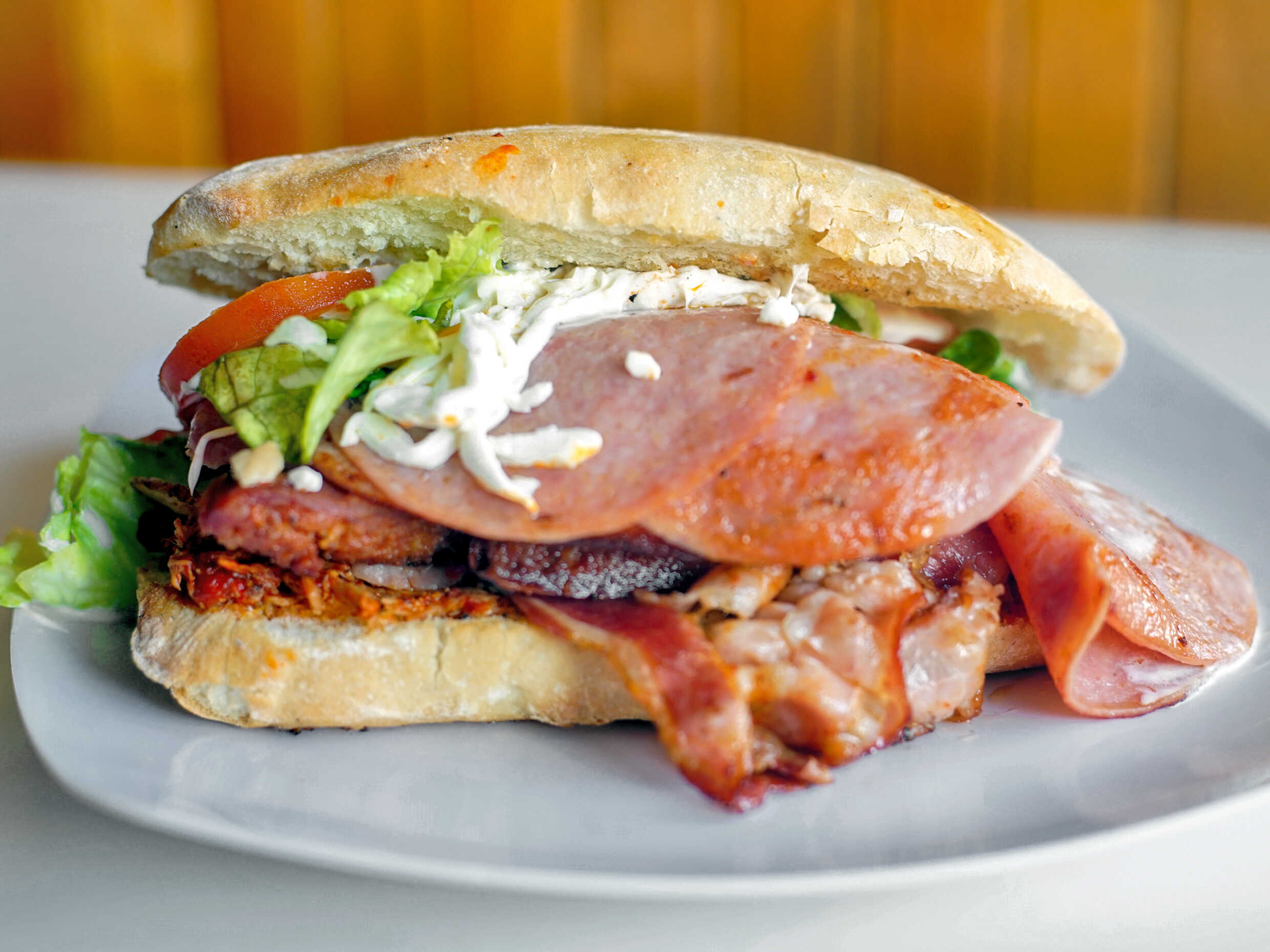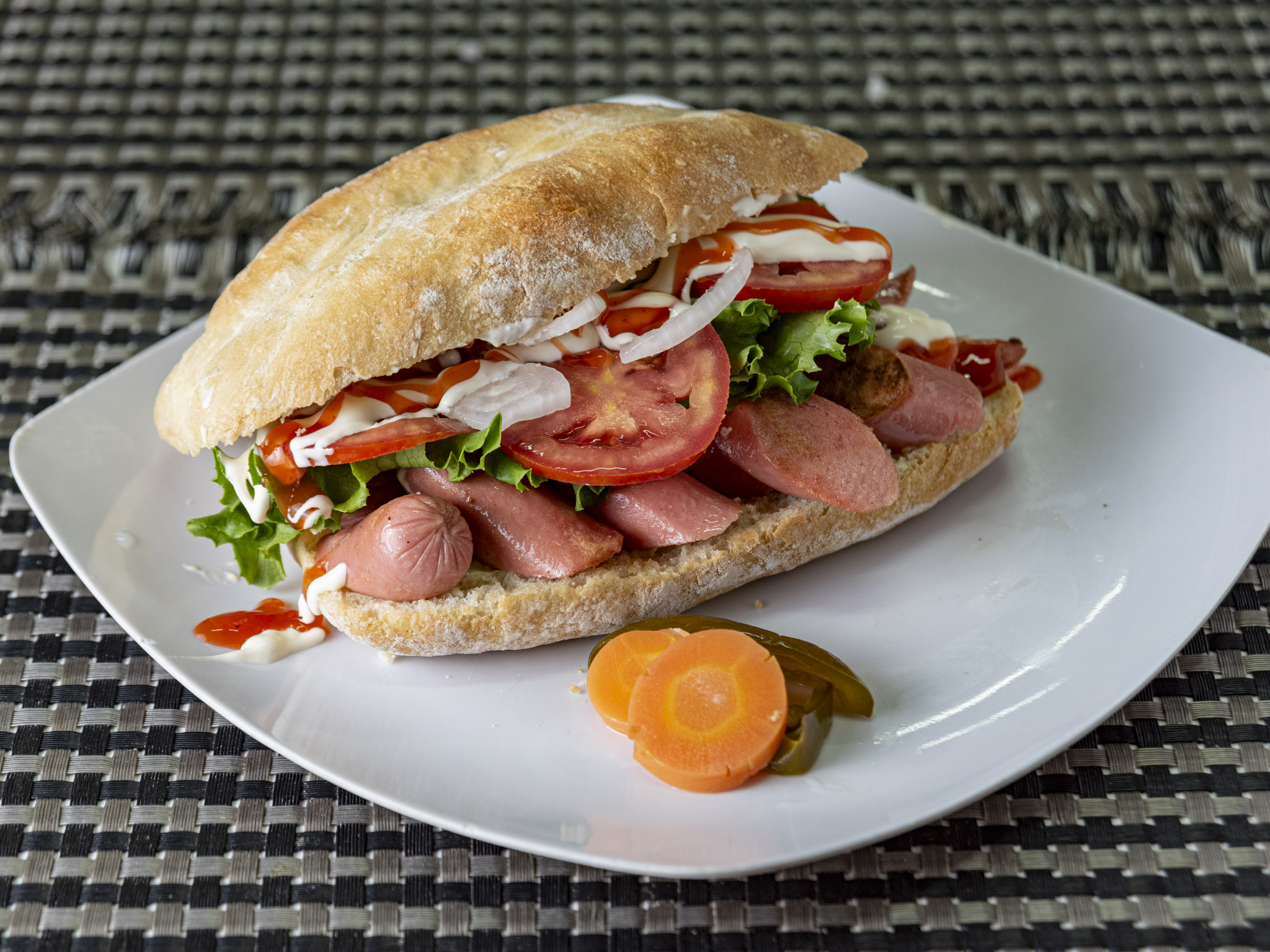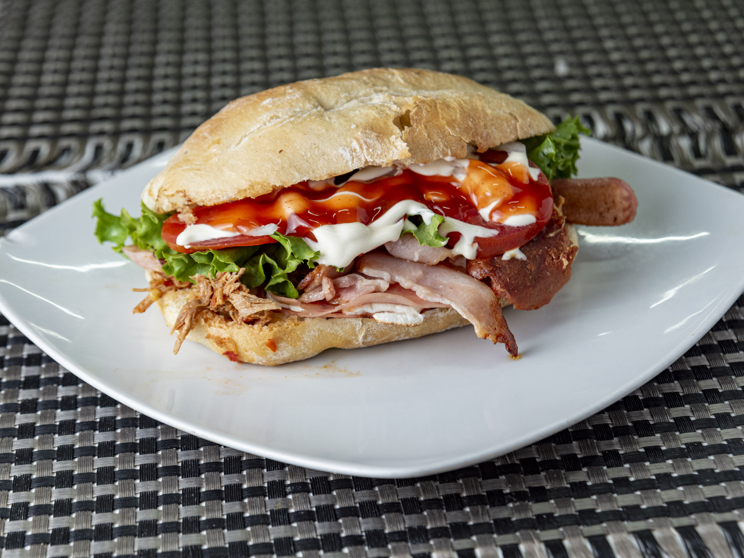 Incluye jamón, chorizo, pierna, salami, salchicha, tocino, lechuga, tomate y cebolla.