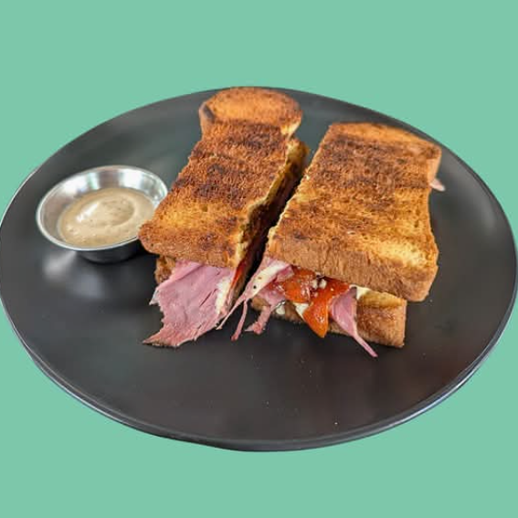 Láminas finas de roast beef en pan brioche, pesto de pistache, pimiento asado y alioli tradicional.