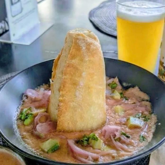 Camarón en birote salado, aguacate, alioli oriental y salsa de tomate confitado.