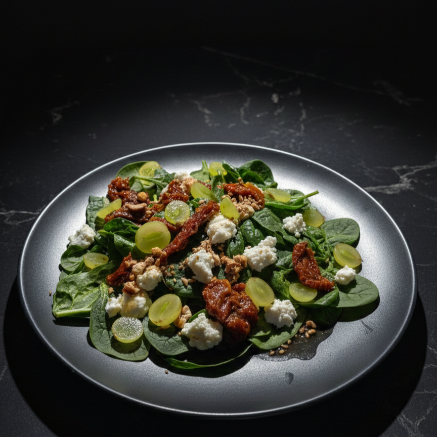 Espinaca, queso de cabra, nuez caramelizada, uva y tomate deshidratado con vinagreta de pimiento.