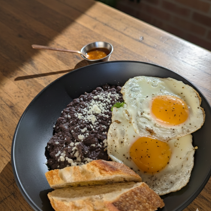 Dos huevos al gusto con frijoles refritos, tortilla de maíz y salsa martajada.