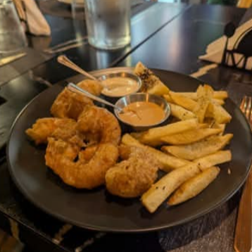 Camarones capeados, salsa tártara con toque de teriyaki y papas fritas de la casa.