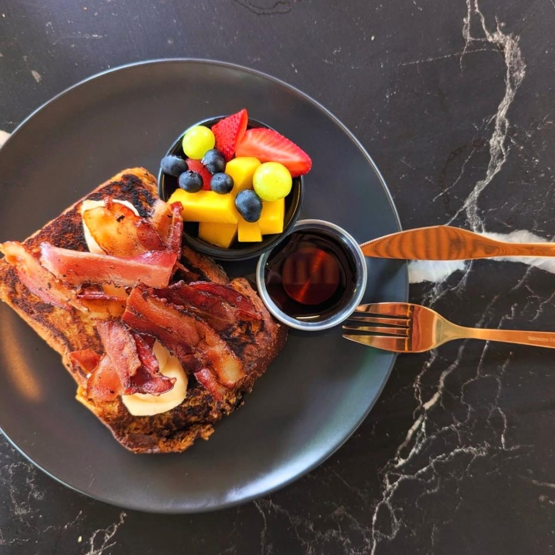 Brioche doble con tocino crujiente, jarabe de maple y fruta fresca.