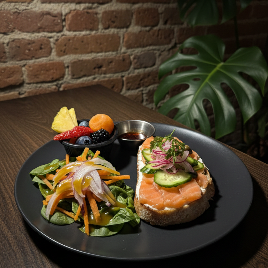 Masa madre tostada con queso crema, láminas de salmón, alcaparras y pepino.