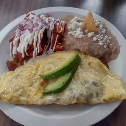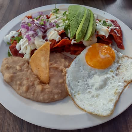 Frijoles, chilaquiles rojos o verdes, queso, crema, cebolla.