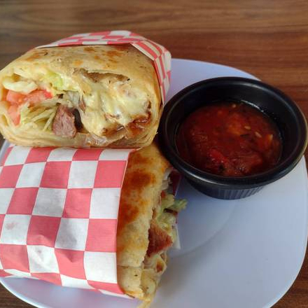 2 Huevos en forma de tortilla (por dentro queso gratinado y proteína de tu preferencia).