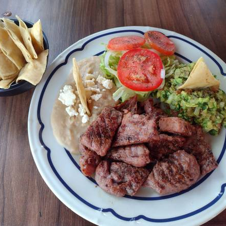 200 g De arrachera marinada, frijoles fritos con queso, ensalada fresca, totopos, guacamole y salsa de tomate.