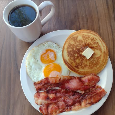 2 Huevos estrellados, tocino crujiente, 3 mini hot cakes y café de olla.