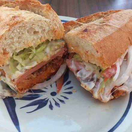 Bolillo, pierna, cerdo, jamón, chorizo, tocino, salchicha, queso gratinado, lechuga, jitomate y cebolla.