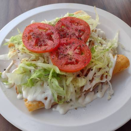 Orden de 4 piezas de burritas de pierna, acompañadas de lechuga, jitomate, cebolla y crema.