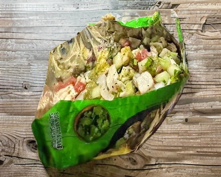 tostitos con base de aguachile negro o rojo cebolla morada y pepino