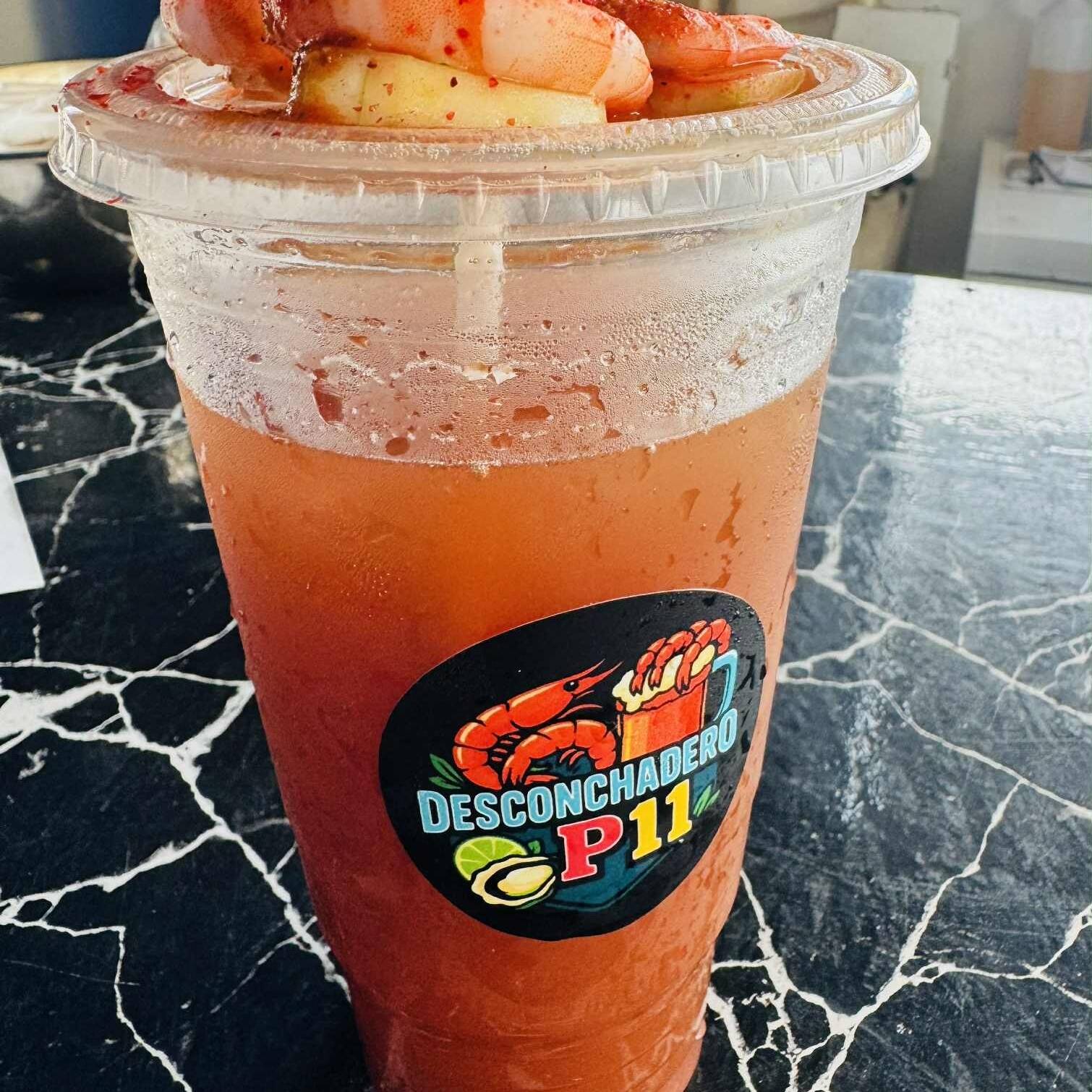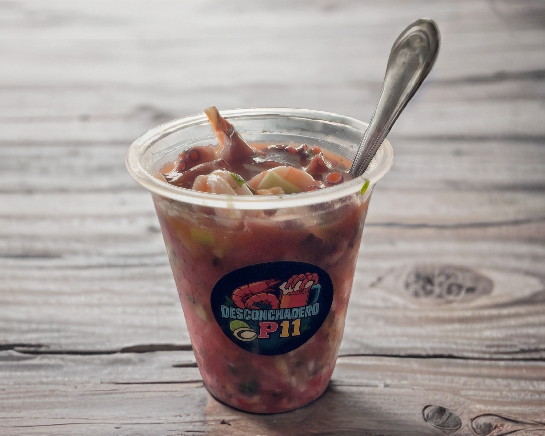coctel de camaron grande, jitomate, cebolla, pepino, cilantro y consome