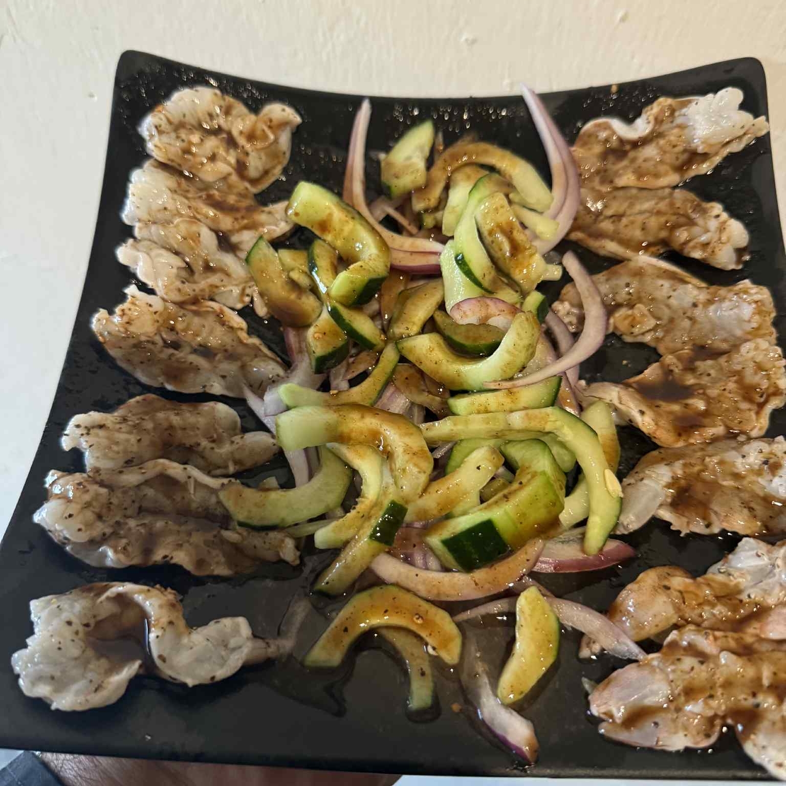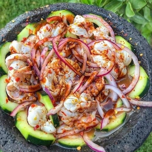aguachile negro de camaron curtido, viene con cebolla morada y pepino, salsa negra picante a base de chile chiltepin