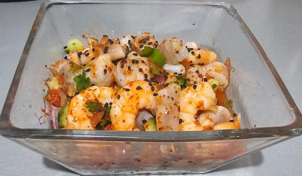 10 camarones ahogados y 10 camarones cocidos sazonados