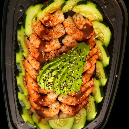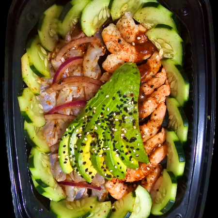 Contiene 160 gr de proteína: camarón crudo, camarón cocido, pulpo, atún, pescado y callo de almeja; pepino, cebolla morada y puedes escoger tu salsa favorita. Incluye totopos y saladitas.