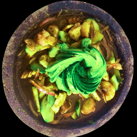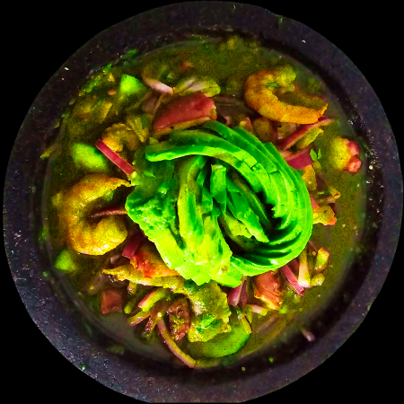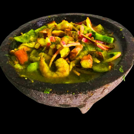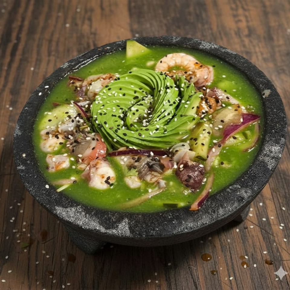 Mitad camarones mitad pulpo, pepino, cebolla morada y salsa verde con base de tomate verde. Incluye totopos y saladitas.