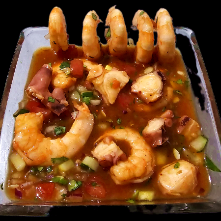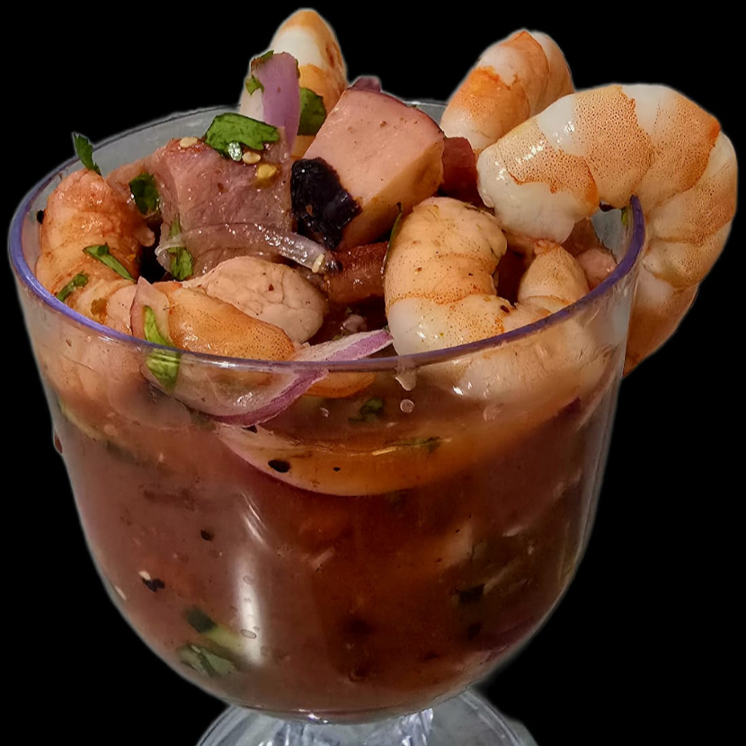Contiene camarón crudo, camarón cocido, pulpo, pico de gallo y un toque de Clamato. Incluye totopos y saladitas.
