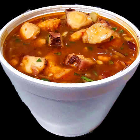 Contiene 130 g de pulpo aproximadamente, pepino, cebolla morada (opcional al realizar el pedido) y salsa a base de guajillo con un toque Clamato y chiltepín. Incluye totopos y saladitas.