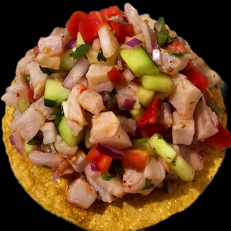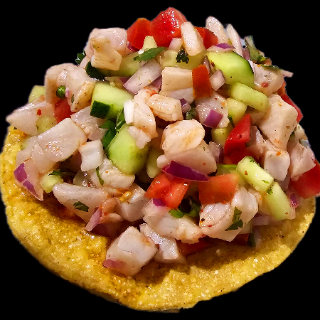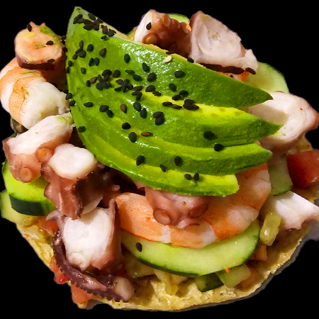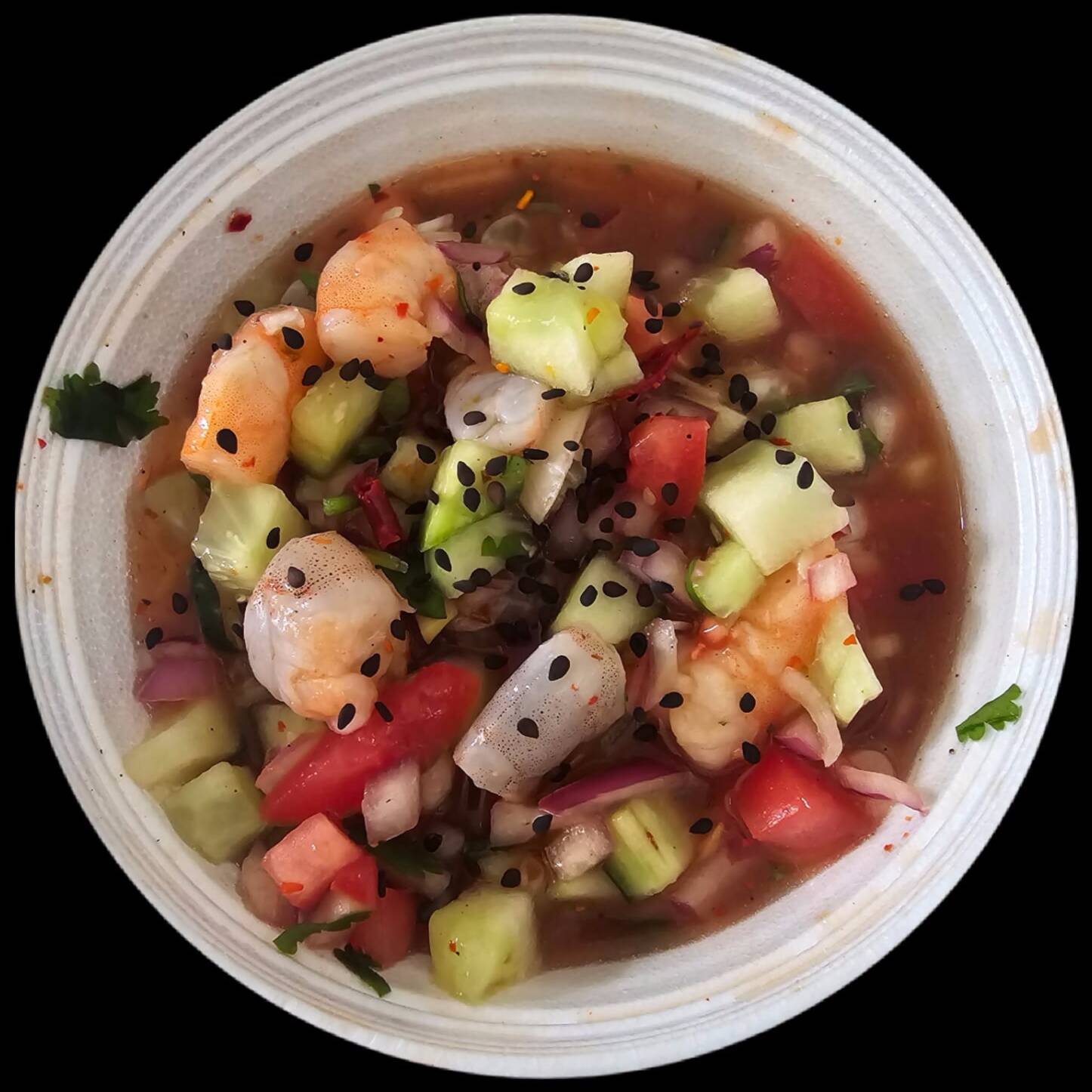 Contiene 320 gr de proteína: camarón crudo, camarón cocido, pulpo, atún y pescado, pepino, pico de gallo y salsa de la casa. Incluye totopos y saladitas.