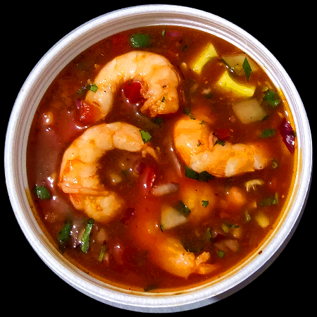 Contiene 10 camarones, pepino, cebolla morada y salsa a base de guajillo con un toque Clamato y chiltepín. Incluye totopos y saladitas.