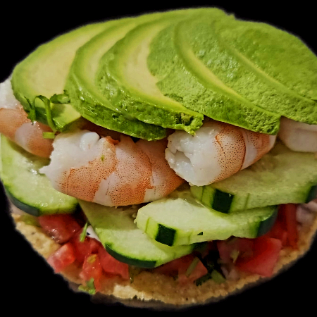 10 Camarones, pepino, cebolla morada y salsa verde con base de tomate verde. Incluye totopos y saladitas.