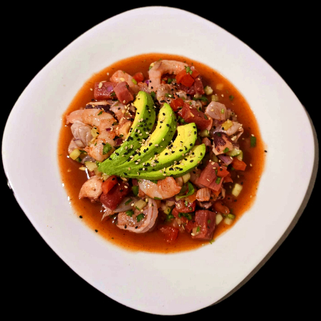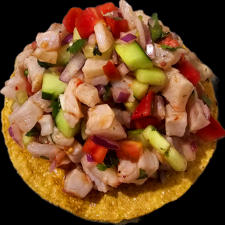 Contiene 320 gr de proteína: camarón crudo, camarón cocido, pulpo, atún, callo de almeja y pescado, pepino, pico de gallo y salsa de la casa. Incluye totopos y saladitas.