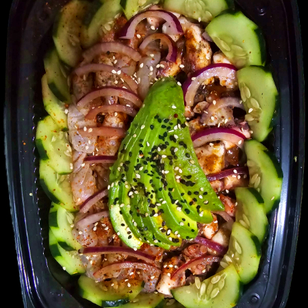 Contiene 160 gr de proteína: camarón crudo, camarón cocido, pulpo, atún, pescado; pepino, cebolla morada y puedes escoger tu salsa favorita. Incluye totopos y saladitas.