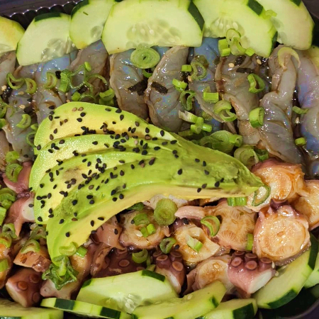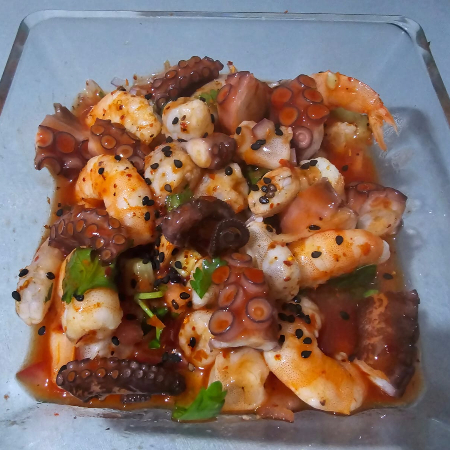 Camarón crudo y pulpo cocido combinados y bañados en la salsa sashimi especial de la casa (la salsa contiene ajonjolí)