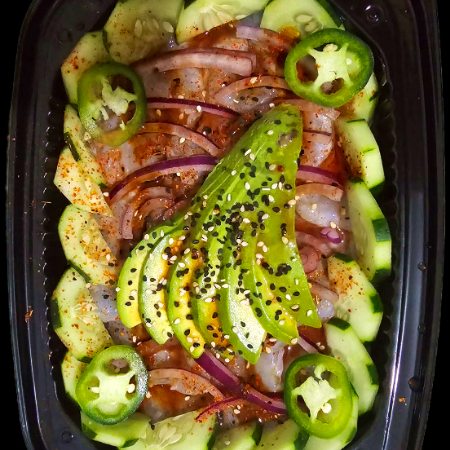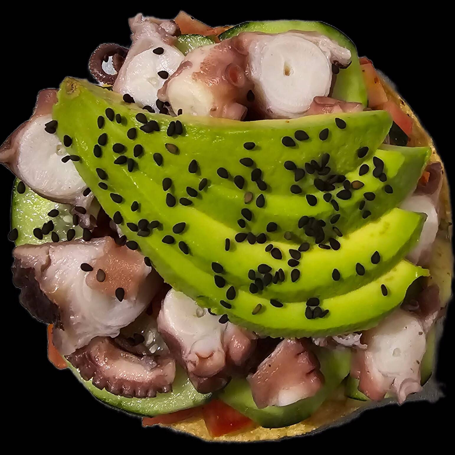 Contiene 260 g de pulpo aproximadamente, pepino, cebolla morada y salsas negras con un toque de chilaca. Incluye totopos y saladitas.