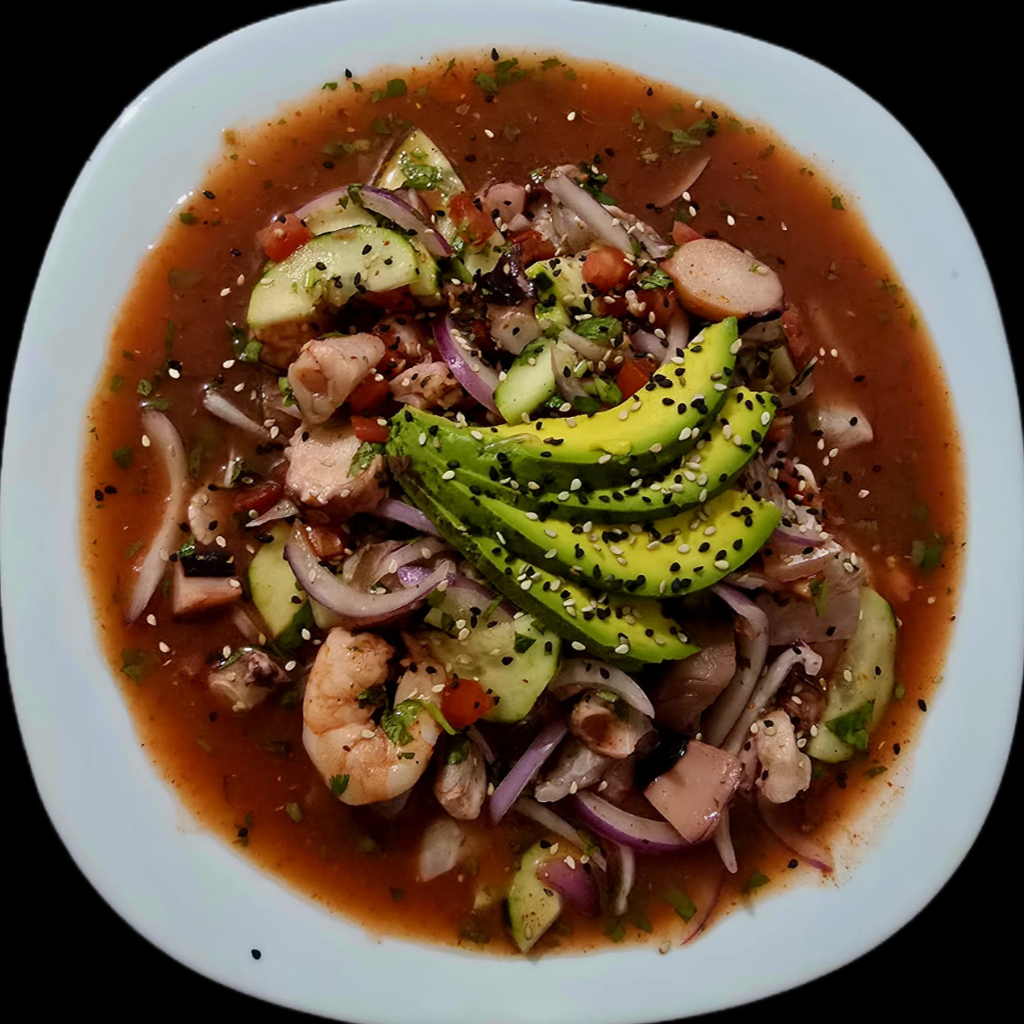 Contiene mitad camarones, mitad pulpo, pepino, cebolla morada (opcional al realizar el pedido) y salsa a base de guajillo con un toque Clamato y chiltepín. Incluye totopos y saladitas.