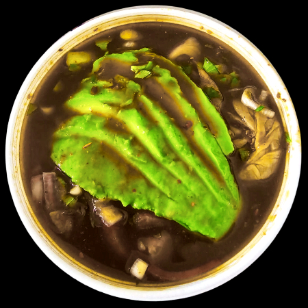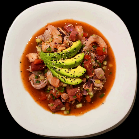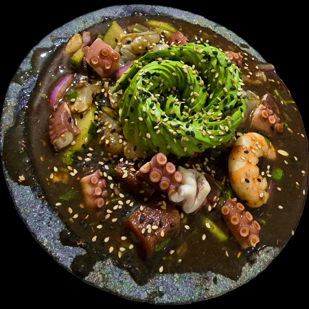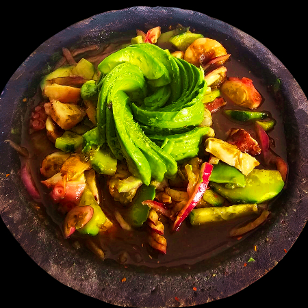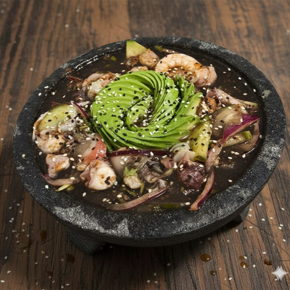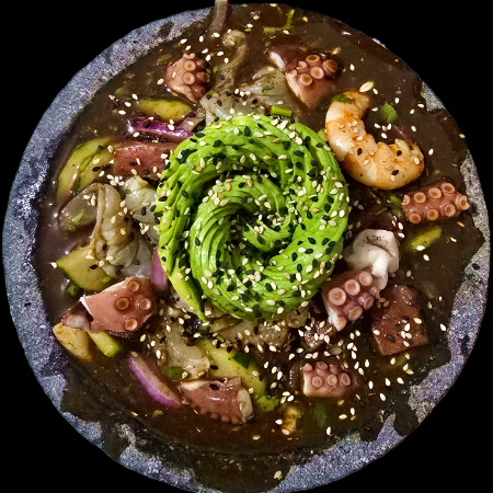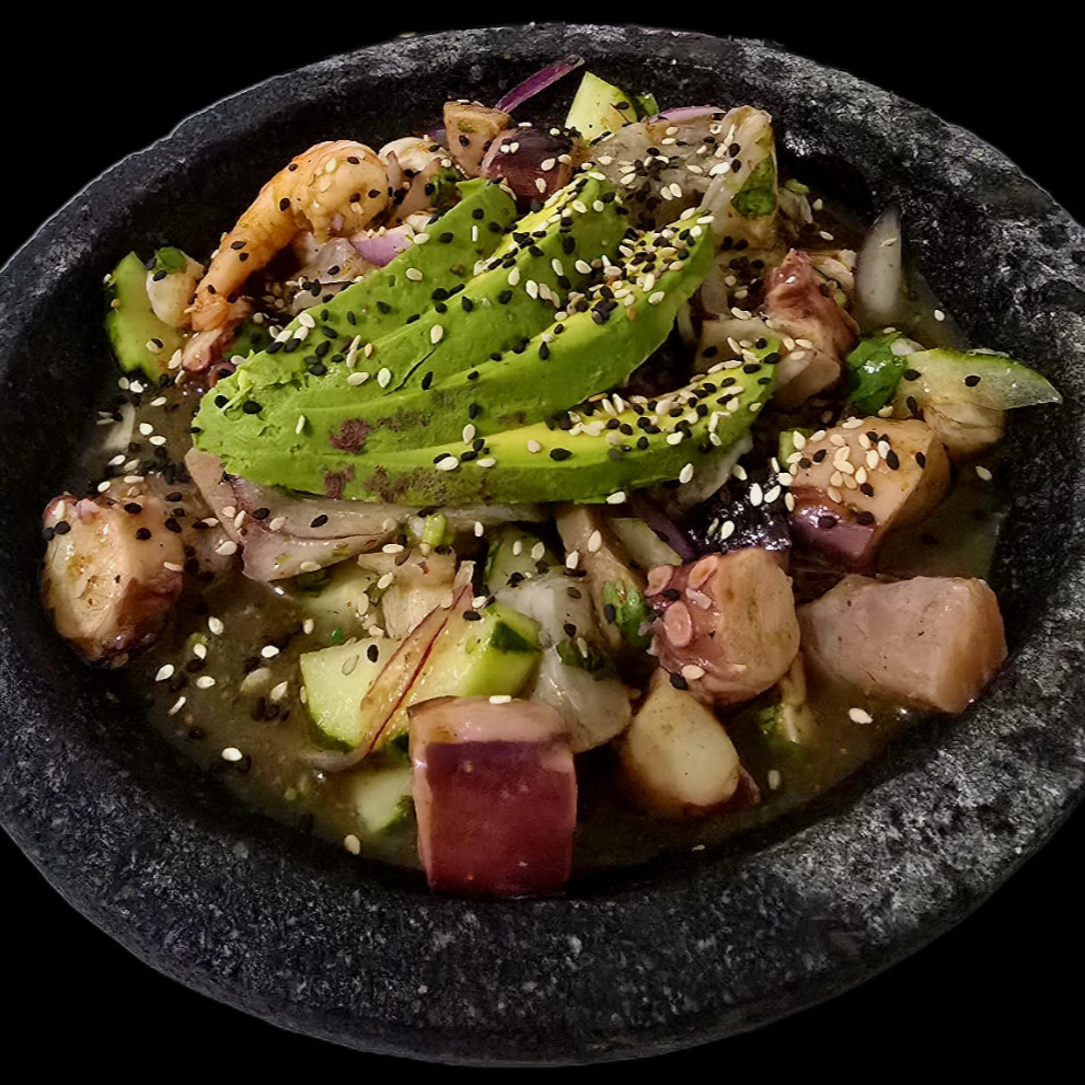 Contiene mitad camarones mitad pulpo, pepino, cebolla morada y salsas negras con un toque de chilaca. Incluye totopos y saladitas.