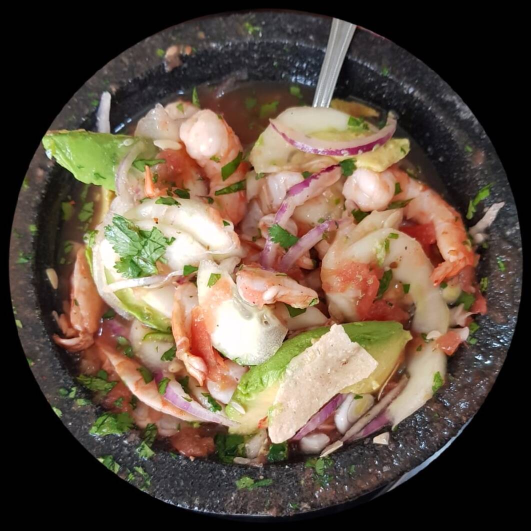 Contiene mitad camarones-mitad pulpo, pepino, jitomate, cebolla morada. Incluye totopos y saladitas.