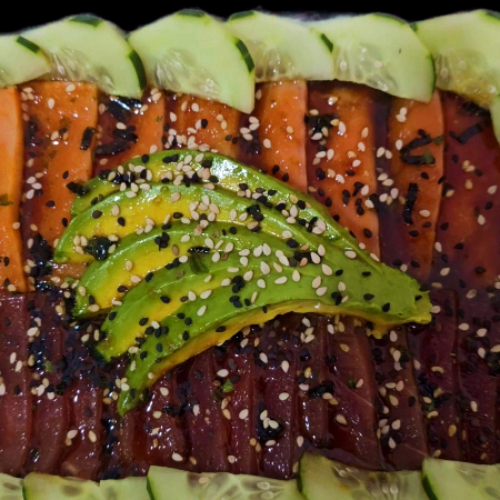 Finas tiras de salmón combinado con finas tiras de atún, camarón crudo y pulpo cocido, bañados en la salsa sashimi especial de la casa (la salsa contiene ajonjolí)