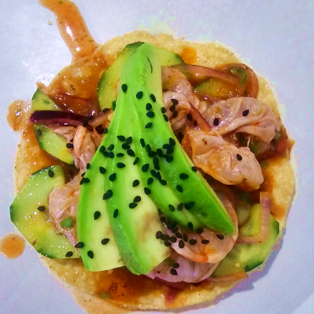 Tostada de aguachile negro de camarón (base de salsas negras con un toque de chilaca)