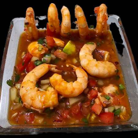 Contiene camarón crudo, camarón cocido, pico de gallo y un toque de Clamato. Incluye totopos y saladitas.