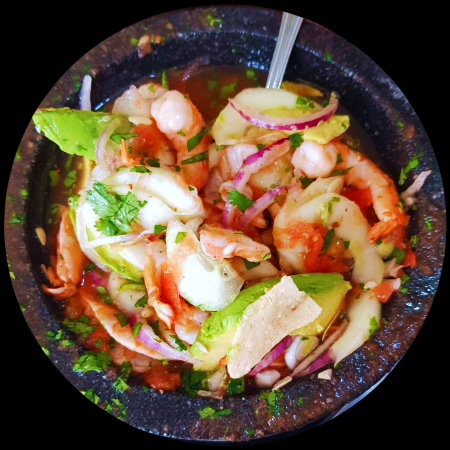 Contiene 10 camarones, pepino, cebolla morada y salsas negras con un toque de chilaca. Incluye totopos y saladitas.