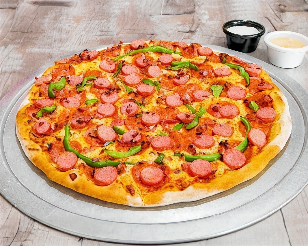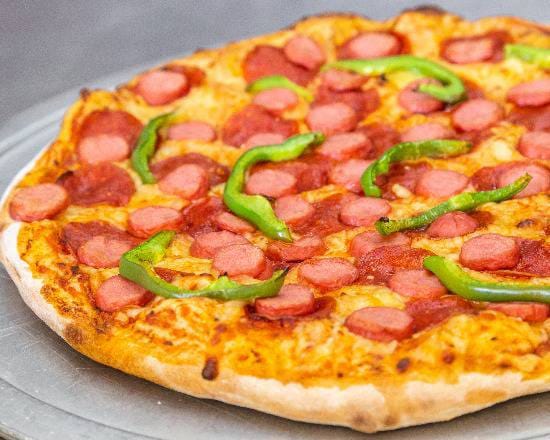 Pizza grande de 35 cm de diámetro, 8 rebanadas con ingredientes a elegir 3 a 4 persona