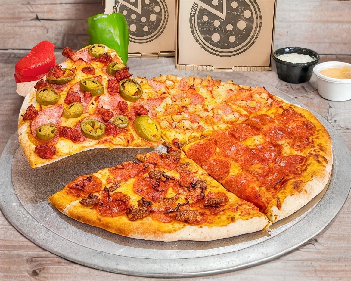 Pizza Grande de 35 cm, 8 rebanadas. A elegir entre 4X, Mexicana, Suprema o Double Flow. Elige un sabor entre estos 4. Para 4 personas maximo