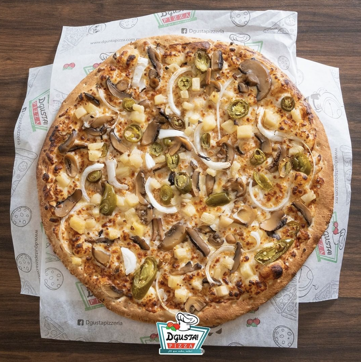 Pizza de champiñón, piña, rodajas de jalapeño y cebolla.
