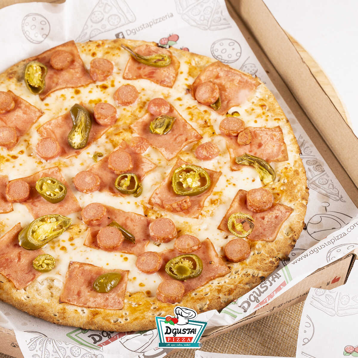 Pizza de jamón, salchicha y rodajas de chile jalapeño.
