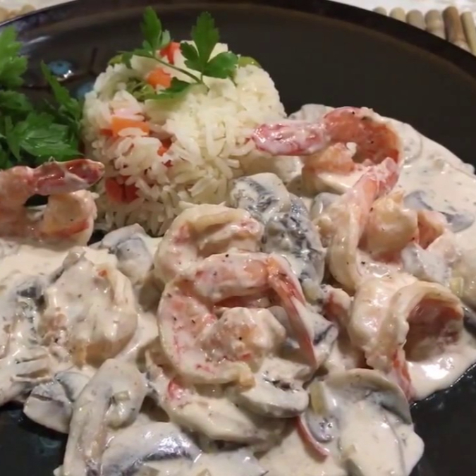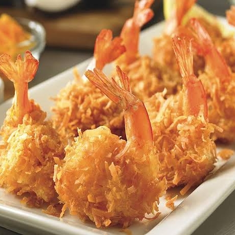 CAMARONES AL COCO ACOMPAÑADOS DE PASTA ALFREDO Y ENSALADA.