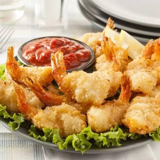 CAMARONES EMPANIZADOS ACOMPAÑADOS DE PASTA ALFREDO Y ENSALADA