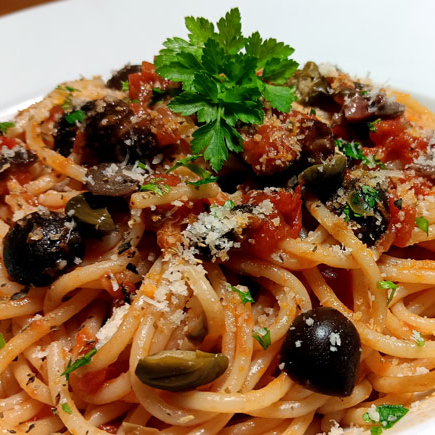 SPAGUETTI PUTANESCA CON CHAMPINONES