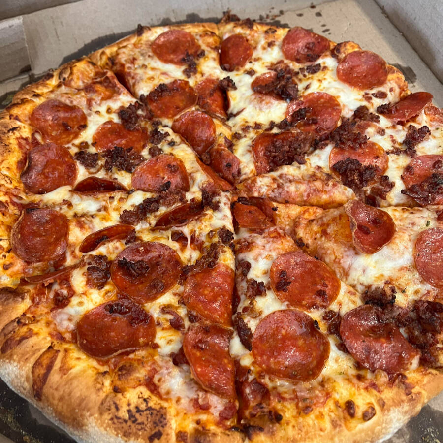 pepperoni crujiente, trozos de tocino ahumado y una mezcla fundida de quesos premium sobre nuestra masa artesanal doradita. ¡Imposible comer solo una rebanada