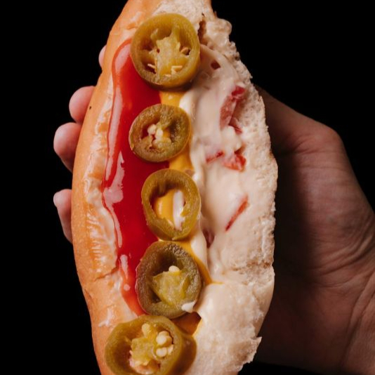 Pan artesanal con salchicha 1/4 de kilo envuelta en doble tocino, tomate, cebolla, mayonesa, cátsup y jalapeños, 120 gramos de papas a la francesa y un refresco jarrito.