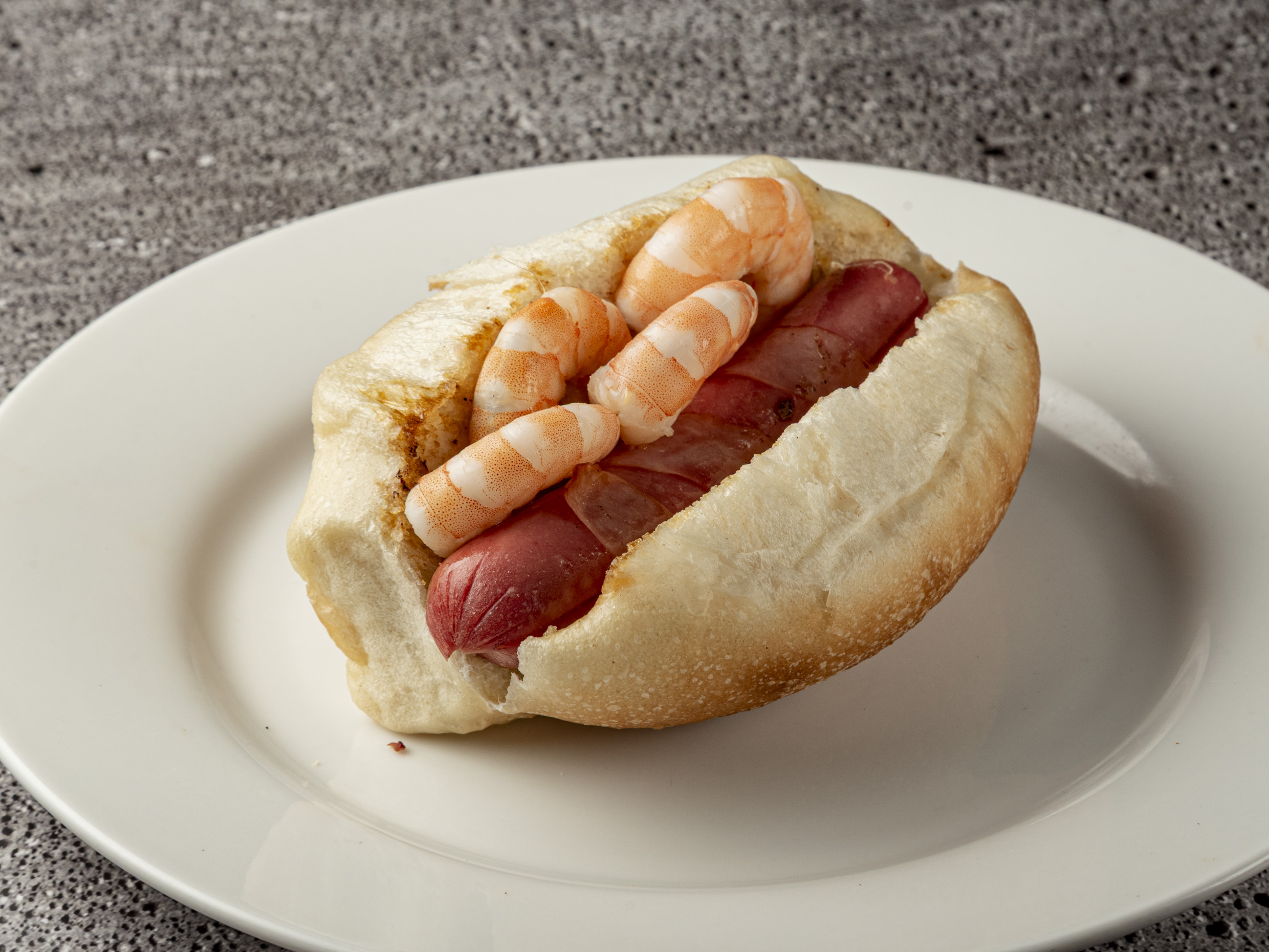 Pan artesanal, salchicha de pavo envuelta en tocino, camarones con queso mozarella, jitomate, cebolla, crema y catsup