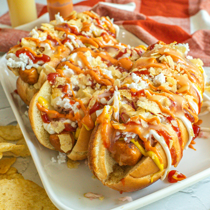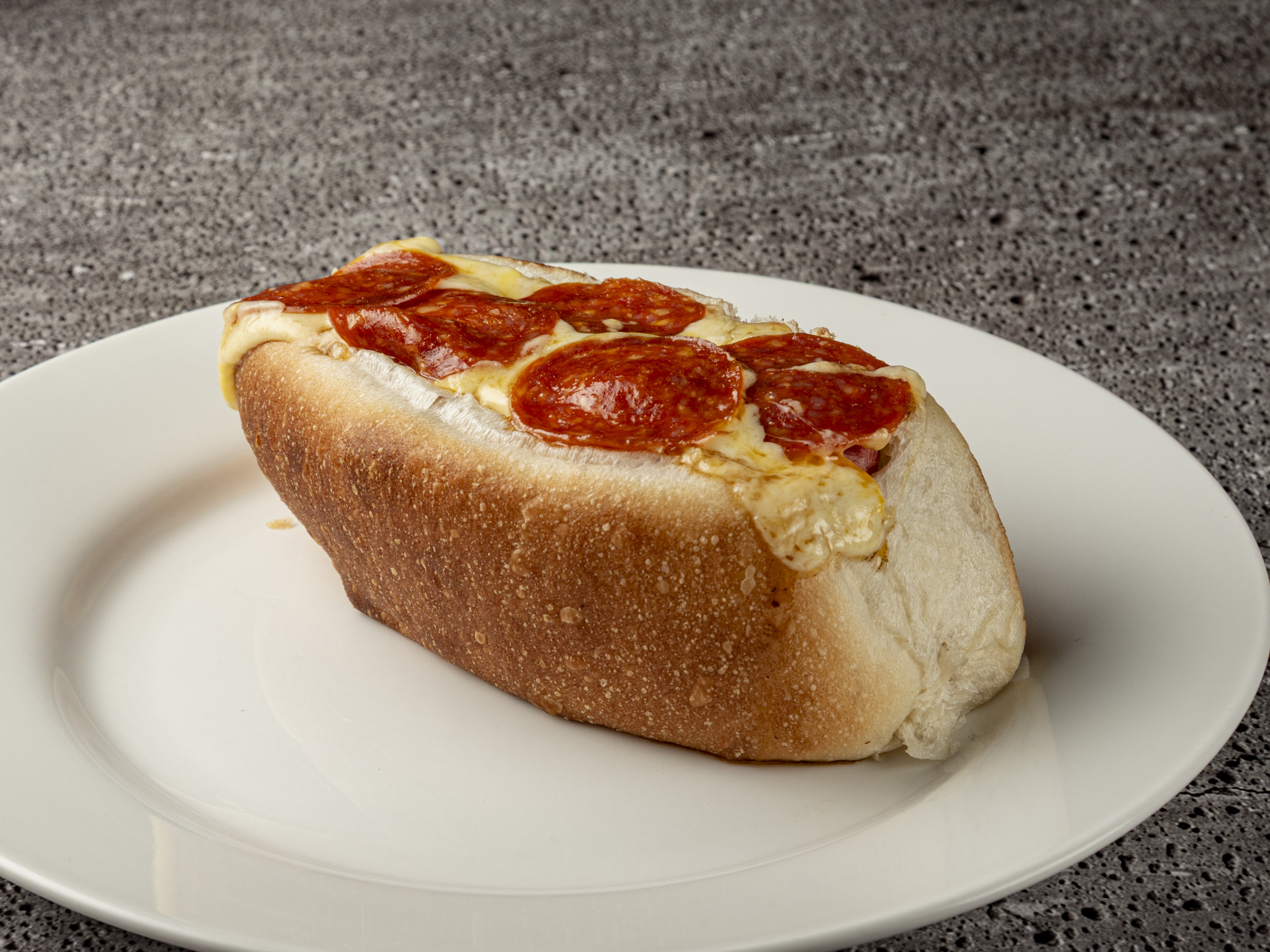 Pan artesanal, salchicha de pavo envuelta en tocino, queso mozarella fundido con peperonis, jitomate, cebolla, crema y catsup