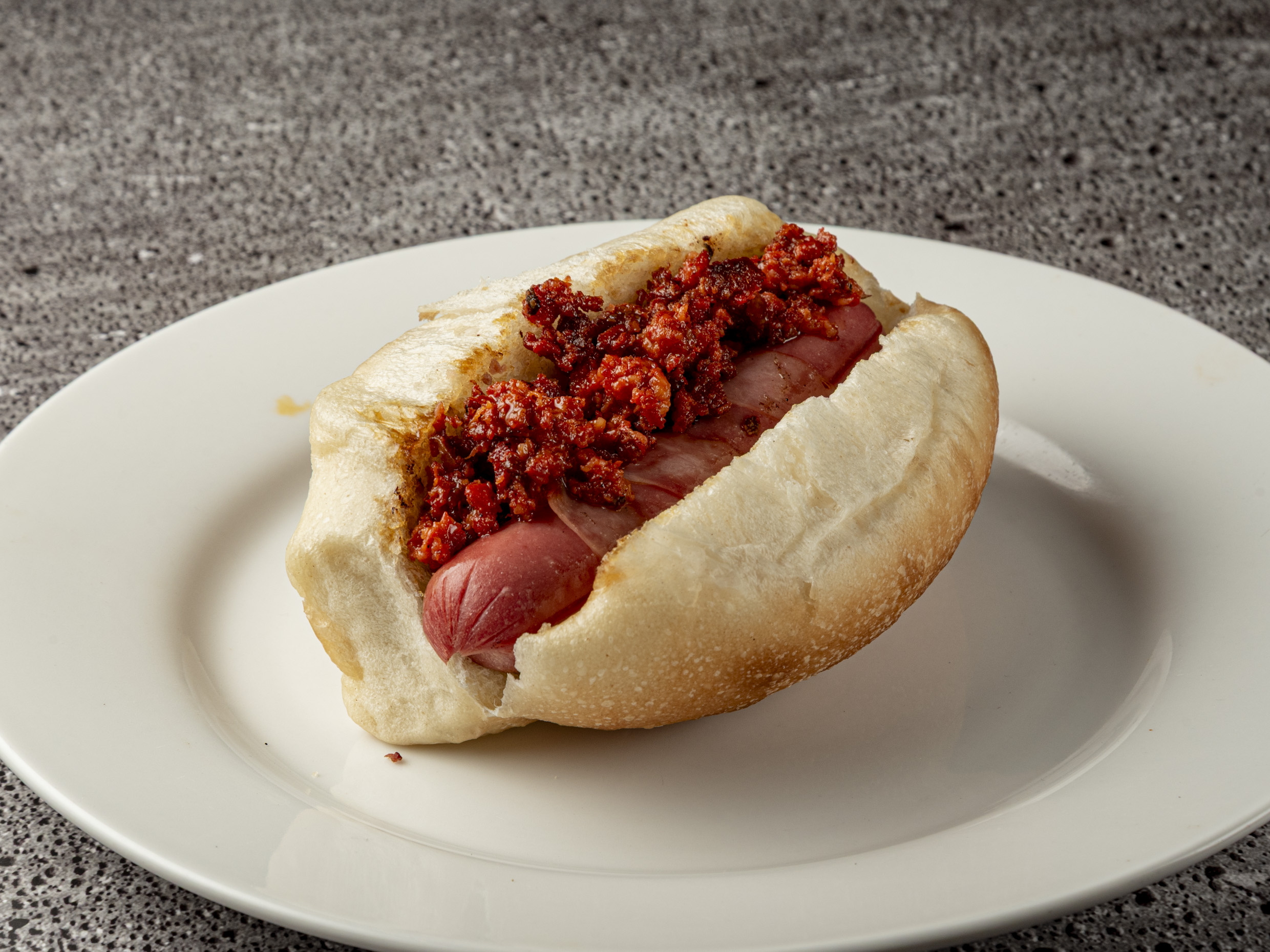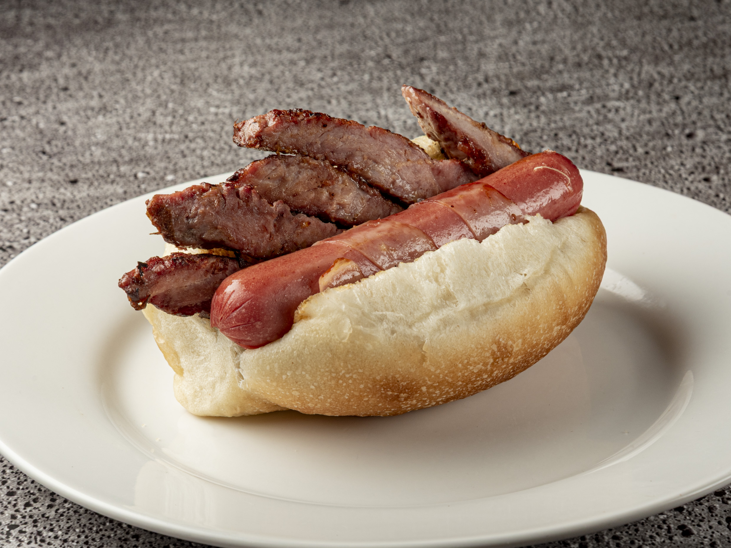 Pan artesanal, salchicha de pavo con tocino, arrachera, jitomate, cebolla, crema y cebolla guisada.