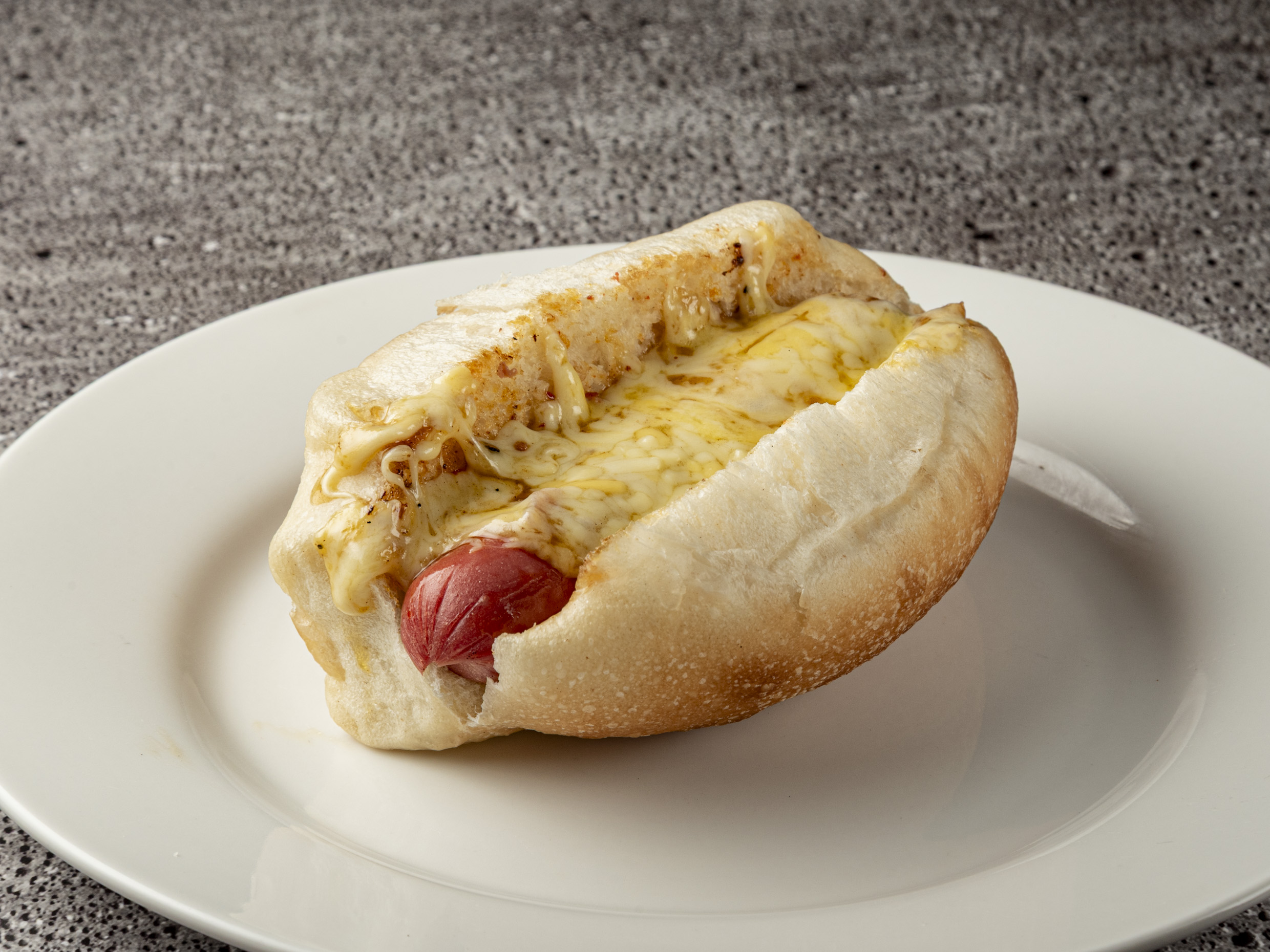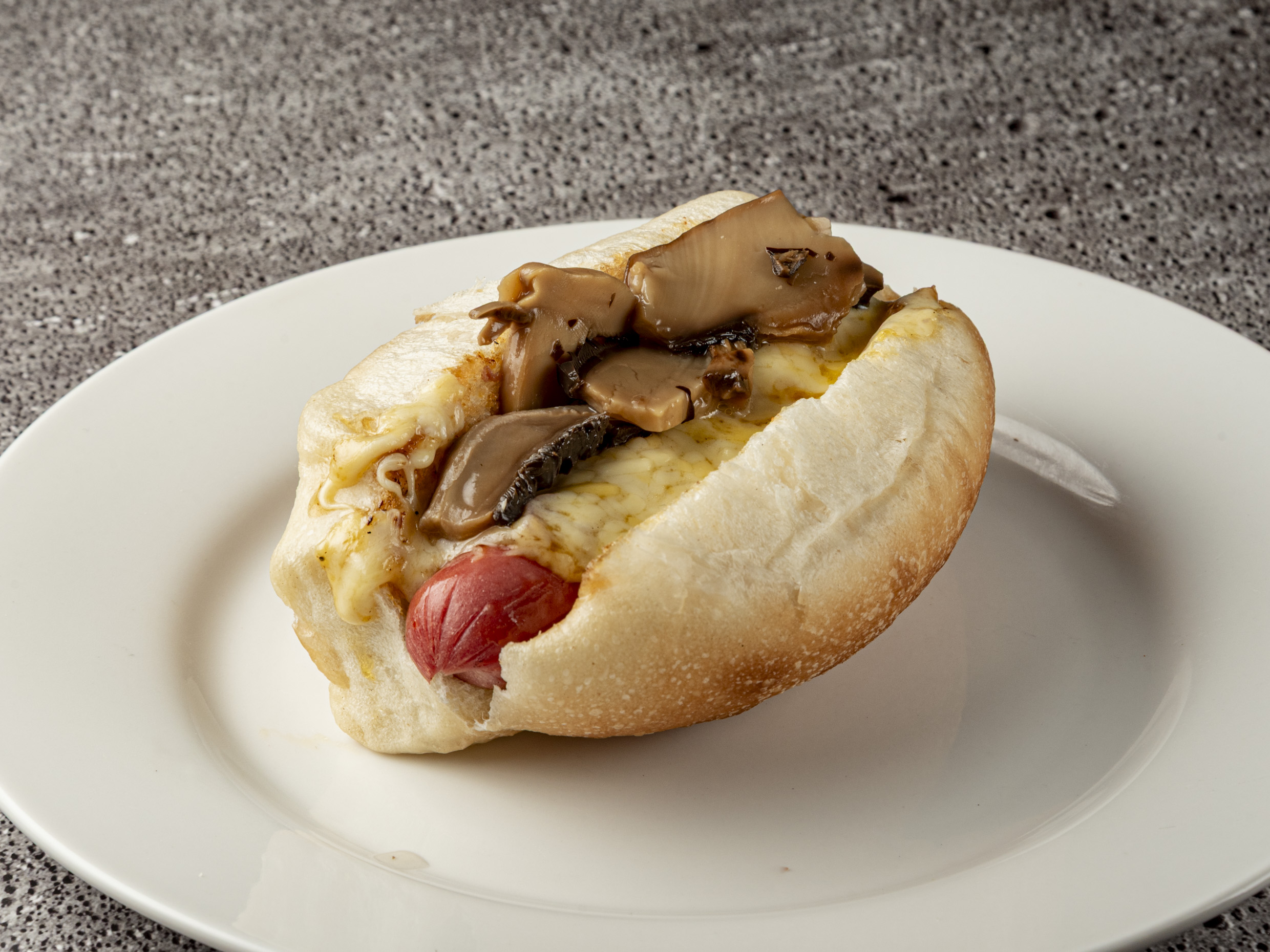 Pan artesanal, salchicha de pavo envuelta en tocino, chamopiñones gratinados en queso mozarella, jitomate, cebolla, crema y catsup
